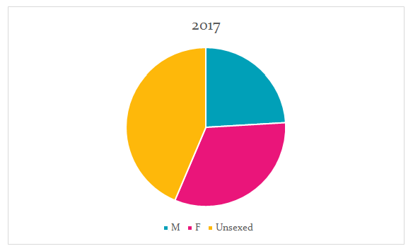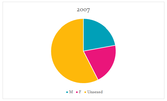 Additionally, sex-based categorization of cases as seen in Figure 5 shows minimal variation in the splits in 2007 compared to 2017. Statistical analysis of these cases has shown no significant difference in the numbers of males, females and unidentified individuals in these years. Better record-keeping of the sex of birds, to reduce the numbers unidentified, would be useful to better analyze the data, however the limitation is that sexing raptors is known to be difficult in non-sexually dimorphic species.