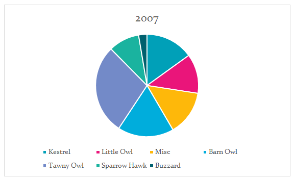 The numbers of kestrels and tawny owls were compared in each year, to see if there was a significant difference in the prevalence of these species (Figure 6). Both were found to be significantly difference in 2007 and 2017, with kestrels being found in greater number in 2017 and tawny owls in 2007 (kestrels = P value of 0.04, 1 degree of freedom, chi-square of 4.136 and tawny owls = P value of 0.005, 1 degree of freedom, chi-square of 7.745) Appendix 1&2.