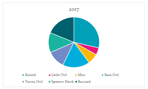 Analysis of species-based categorization of cases in Figure 6 shows the variation of species in each year. Tawny owls were the predominant species seen in 2007 (32 birds out of 113, p = 0.005), while kestrels were the most predominant species in 2017 (38 birds out of 133, p = 0.04). Further analysis of the records is needed to assess whether these species differences have affected the outcome results for these years, as papers such as Mason (2010) describe how certain species can do better in temporary captivity than others.