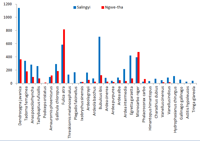 In this study, a total of 8832 individuals of 29 waterbird species were recorded from two different reservoirs namely, Salingyi and Ngwe-tha reservoir at Sagaing Region. In Salingyi reservoir, the 5988 individuals of 28 species were recorded and the 2844 individuals of 22 species were in Ngwe-tha reservoir during the study period. The individual of waterbirds in Salingyi reservoir were more observed than in Ngwe-tha reservoir. These differences are due to the habitat conditions of two reservoirs where Salingyi reservoir has more diverse habitat compared to Ngwe-tha reservoir. Salingyi reservoir composed of open water area, shallow water area, marshy swamp, damp soil, flooded agricultural fields, cultivated fields, shrub and bushy area, small grass land and small trees around the study area. Ngwe-tha reservoir composed of a wide open water area and edge of open water area. Myo Sandar Win14 stated that the bird abundance is directly related to the habitat types and conditions. The distribution and abundance of many bird species are determined by the composition of the vegetation that comprises a major element of their habitats.15