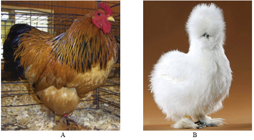 Silkie chicken (SE): (Figure 1B), is a stocky chicken with a rounded body shape with a gently rising back line and a medium-high posture. It has a soft, fluffy feather appearance. It has been compared to silk, and to fur. This characteristic leaves silkies unable to fly.6 Silkies appear in two distinct varieties: bearded and non-bearded. Bearded silkies have an extra tuft of feathers under the beak area that covers the earlobes. They also are separated according to color. Colors of Silkie recognized for competitive showing include black, blue, splash, lavender, grey, partridge, and white. The standards of perfection call for all Silkies to have a small walnut-shaped comb, black or bluish skin, bones, grayish-black meat dark, and turquoise-blue earlobes. In addition to these defining characteristics, Silkies have five toes on each foot A well-developed crest is directed backwards. The transversely running ridge is blue-red in color. The weight of the rooster is 1.1–2.0 kg, and the hens 0.9–1.4 kg. Silkies lay a fair number of eggs, ranging from white to cream or light tan, but production is often interrupted due to their extreme tendency to go broody. A silkie hen can produce 100 eggs in an ideal year. Their capacity for incubation, which has been selectively bred out of most fowl bred especially for egg production, is often exploited by poultry keepers by allowing Silkies to raise the offspring of other birds.7 Knock-out defects of breeding features include too narrow and long body, weak, un silky, hard plumage, underdeveloped feathers, weakly separated fingers on the legs, nonfeathered legs, other coloring of the skin, feathers, legs and comb, growths on the comb, lack of groove on the comb and a significantly lightened eye color.8