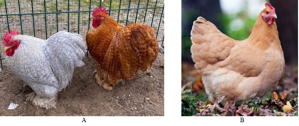 Orpington bantam (OB): (Figure 2B), are hens with a square body frame, with a rich, non-curly plumage that enhances their voluminous body. Characteristic features of the exterior are consistent with the large form of the breed.1 The head is wide, a simple comb is medium in size. The eyes are most often orange-red. They have full and deep breasts, a short and wide back that passes into a short, medium-set tail. The legs are short and strong. The first bred color character was black, today it is bred in eleven color variations, most often in yellow and black. The weight of the rooster is 2.0 kg, and the hens 1.6 kg. Knock-out defects in breeding traits include too narrow body, cushions on the back, too long or invisible dorsal line, high and flat breasts, incorrect posture, long, low-borne, pointed or very open tail, narrow feathers and a color or drawing other than that of the standard.10,11