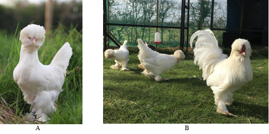 Sultan chicken (SL): (Figure 3), have a great deal of decorative plumage, including large, puffy crests, beards, long tails, and profuse foot feathering. Their small, V-shaped combs are almost entirely hidden under feathering. The skull is bulging, forming a base for the crest. The crest is round and dense, formed by longer lips, periodically ray-like. The beak is short, strongly hooked, the chin is expressive and rich, divided into a round chin that covers the throat and a sideburn that covers the auricle and face. The torso is horizontal. Relatively short legs are feathered on the outside. In a rooster, the tail is wide, carried high. Sultans are also one of a minority of breeds to have five toes on each foot. The breed has only one recognized color – white. They belong to flightless breeds weighing 1.5-2.0 kg in roosters and 1.0-1.5 kg in hens. Knock-out defects in breeding traits include a rough constitution, or too angular body shape, too high posture, too little developed or oblique crest, lack of feathering of the legs and lack of cuff formation, missing fifth finger, blue skin, overhanging eye arches.13