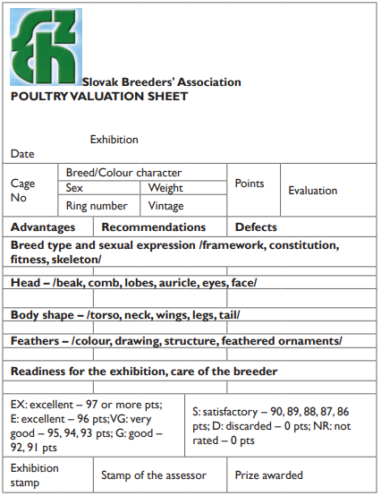 Poultry at exhibitions are evaluated by trained reviewers with sufficient theoretical and practical experience and completed training. The evaluation of poultry takes place even before the start of the exhibition without public access. Everyone is compared in detail with the appropriate standard. For the correct assessment of a particular individual, its body structure and individual body proportions and details, knowledge of the specifics of individual poultry breeds, the coloring and drawings of their plumage, the current trend of breeding the respective breeds and the direction of poultry breeding are necessary.1,15