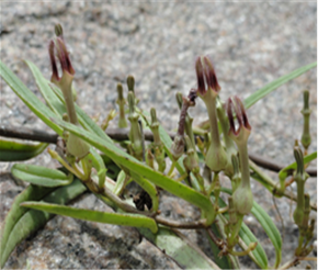 Out of almost 49 species of Ceropegia that are found in India, Ceropegia bulbosa Roxb is widely distributed yet threatened. It’s a climber to 60 cm high with a root system that is a discoid or depressed globose tuber (± 40–60 mm diameter × 30 mm deep) with many fibrous roots arising from sides and base, smooth or with a rough, grey peeling bark. The stem is sparsely branched, wiry and mostly glabrous. The Leaves are herbaceous, subsessile to shortly petiolate; lamina is linear (30–70 × 3–5 mm) and the base cuneate, apex acute and sometimes apiculate, both surfaces glabrous and sometimes tinged purplish, margin sparsely ciliate. Inflorescence a pseudoumbellate cyme, 5–6-flowered, flowers developing successively, scent very faint musky; peduncle 6–15. Sepals (1–2 × 0.5 mm) in size, recurved, greenish or faintly purplish in color and are glabrous (Figure 4). The corolla of the plant is (17–28 mm long) with a tube (13–23 mm) in basal with a globose inflation (± 5 × 5 mm), narrows abruptly and bends through ± 90° into an ascending cylindrical part. In the fruit, follicles are paired and acutely diverging and apically tapering. The two varieties of Ceropegia bulbosa Roxb.var. bulbosa and Ceropegia bulbosa Roxb. var. lushii are morphologically very similar. Major morphological differentiation lies in the broad leaves of var. bulbosa and narrow leaves of var. lushii.7 Ceropegia bulbosa Roxb.var.lushii is locally known as khappar kaddu, Bhuu-tumbi, Pataal-tumbi, Gilothi, Galot (Punjab) and Hhadulo in Rajasthan.8