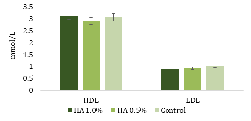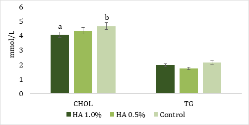 Slightly reduced body weight (P>0.05) in the group of quails fed a diet supplemented with HA at concentration 1.0% could be caused by increased fat metabolism. As a result of increased fat metabolism, were observed lower blood cholesterol levels in HA1 group compared to the control. Apart from lowered cholesterol, the effect on the level of triglicerides was not confirmed between the control and supplemented groups (Graph 1).
