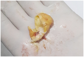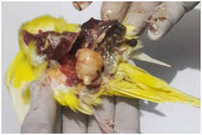 Diagnosis of the egg binding condition is mainly based on the owner’s history and clinical signs. A through physical examination of the individual birds including examination of vent, feathers, feet and abdomen and status on pain evincing while abdominal and coelomic palpation for the detection of eggs. Biochemical analysis of the birds for the complete blood count, serum biochemical profiles including ionized calcium, total calcium, phosphorous, creatinine kinase, creatinine and uric acid levels. Confirmation of the condition determined by the radiographic examination of the abdomen for the presence of eggs with shell and ultrasonography examination if the different visceral organs including reproductive tract. Electrocardiography also utilized for assessment of electrolyte variations.5,7,8 Post-mortem examination of the birds revealed presence of the egg in the reproductive tract (Figure 3) and consistency of the egg shell depends on the levels of calcium and liquefaction of the yolk depends on the duration of the condition (Figure 4).