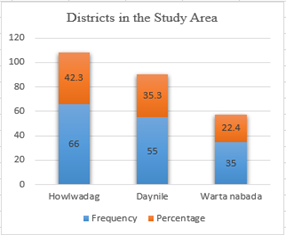 The highest percentage of the respondent was found in the Howlwadag district (42.3%; n=66) and the least was seen in the Warta nabada district where the respondent percentage was (22.4%; n=35) (Figure 1).