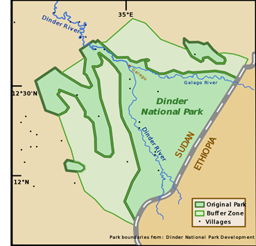 Dinder National Park (DNP) was established in 1935, the park lies between latitude 11° 45 E 12° 50 N and longitude 34° 30 E 36° 00 south-eastern- eastern part of Sudan against the Ethiopian frontier.8