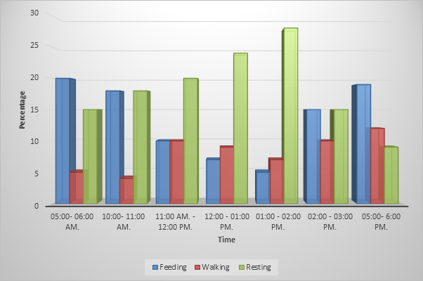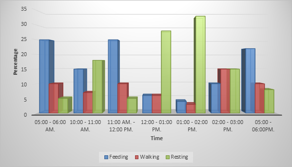 The walking activity dominated at 10:00- 11:00 am and 05:00 - 06:00 pm during March (Figure 2) and peaked at 02:00- 03:00 pm and followed by 11:00 - 12:00 pm and 05:00- 06:00 pm in April and this may be attributed to the searching for food in the morning and leaving to their roosting sites in the evening.