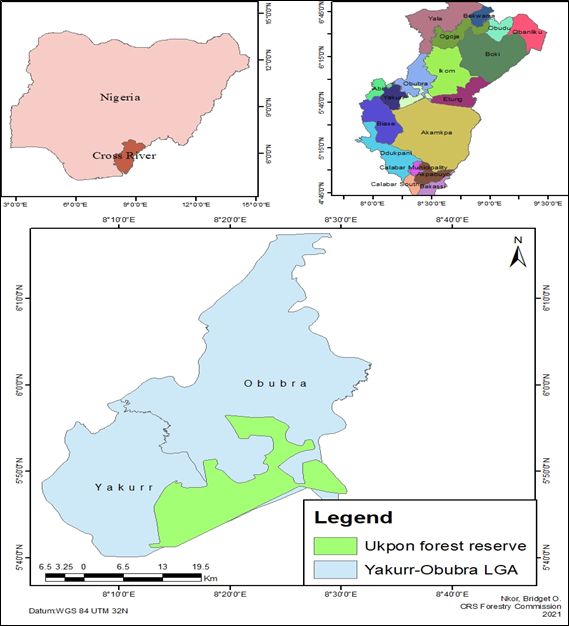 Okpon River Forest Reserve was gazetted by Cross River State in 1930. The reserve occupied a land mass of 31,300 hectares, covering two local government areas, Obubra and Yakurr, respectively. The Reserve lies between Latitudes 50 . 401 ,50.501 and 60.001, 60 .101 North of the Equator and Longitude 80. 101 ,80. 201 and 80.301 , 80. 401 East of the Greenwich Meridian Figure 1. The reserve is bounded in the north by Etung and Ikom LGAs, south by Baise LGA, west by Abi LGA, and east by Eboyi State.