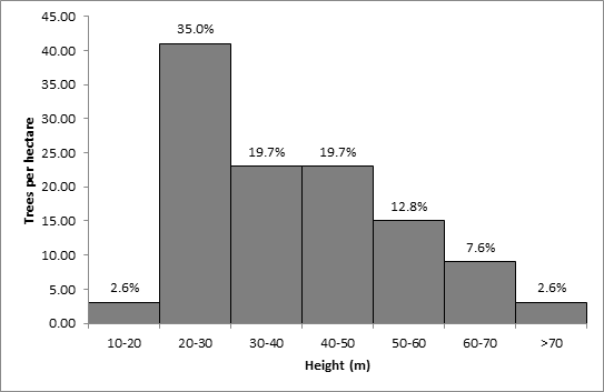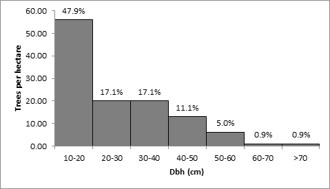 Diameter and height distributions reflect the horizontal structure and vertical pattern of the forest; these are indications that the forest has the potential for continuous growth. However, the presence of large trees has been reported to be a sign of mature tropical rainforest Zang et al. According to Adekunle et al.,7 222 tree stands were found to be in the lower Dbh class of 10–20 cm, followed by 21–30 cm, which had 78 tree stands, and 72 tree stands in the higher Dbh class of 81 cm. Hence, he reported that the diameter distribution indicated healthy recruitment potentials. The lower-class diameter tree stands could develop into mature trees and replace the old ones in the future if proper conservation efforts are sustained. Thus, this structure is typical of a natural forest.8,9 The minimum and maximum Dbh of trees in the study area were 10.1 m and 80.5 m, respectively. The forest reserve was characterized by an abundance of trees with small Dbh, which is not unusual for tropical rainforests. Similar results have been reported by previous workers in other tropical rainforests in Nigeria.10 The reason for relatively fewer number of individual trees with large Dbh values greater than >0.70 (Dbh>70) could be attributed to forest degradation activities which may have removed large individuals as well as the facts that some large-sized trees would have been removed through logging operation for some uses in the past.11