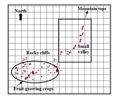 The intensity of site use varied considerably. Macaques penetrated several quadrats only once or twice, whereas the mostly used quadrats accounted for 25% of all recorded locations. There was a significant difference between observed and expected frequencies of quadrat use (χ2=38.64, df=25, p<0.05), suggesting that the macaques select some areas of their habitat. Fifty percent of location records occurred in only seven quadrats. Ten core quadrats together accounted for 70% of all location records (Figure 2). The distribution of group feeding in the home range also showed a similar pattern (Figure 2). During the study period, we recorded group feeding, which occurred within 17 quadrats of home range. 75% of group feeding occurred in only 8 quadrats. There was a significant and positive correlation between the intensity of quadrat use and the group distribution (rs =0.897, n=17, p<0.001). There was a highly significant difference in the use of different zones of the study area (χ2=23.90, df= 3, p<0.001). Field-crops (including Walnut trees) accounted, on average, for 43.7% of the total of the location records, whereas small valleys, cliffs-mount sides and higher valleys averaged, 19.8%, 10.2% and 26.3%%, respectively. Barbary macaques were never seen to use the valley basin during the study period.