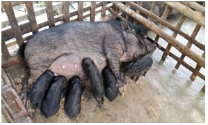 Reproductive performances: Reproductive performances of trial farms are shown in Table 3. Out of ten trial farms, piglets were born in eight farms, one (Trial-2) was shown three times heat but not conceived yet and in another one (Trial-7), boar was become sick then farmer replaced new boar in farm. Out of eight farms where we supplied Black variety, seven sows were pregnant. Again out of two farms where we supplied Dolkomol, one sow was pregnant, but another sow was not pregnant due to sick of boar. Among them, trial-1 (Black) shows higher reproductive performance by giving birth of seven piglets and lowers four piglets in trial-6 (Black). Average piglets production rate is 5.6 in each pregnancy. Feed consumption rate is closely related with reproductive performances. Two sows were not regnant due to imbalance feed supply and farmers careless to management. Therefore, we recommend that balance ration is essential to get piglets and Black variety is the best in piglet production at HHs level (Figure 4).