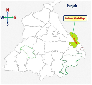 India is divided into 15 agro–climatic regions and out of which trans–Gangetic plain region was selected for the present investigation. Only one state of India comes under trans–Gangetic plain region i.e. Punjab. On the basis of agro–climatic conditions, the state has been divided into 3 zones and of which the sub–mountainous region (Zone III) was selected. Out f 3 districts in sub–mountainous region, one district, block and village named Ropar, Nurpur bedi and Bathlour Khad were randomly selected respectively (Figure 1).