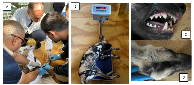 (A); Physical examination of the animal including biological sampling, (B); body weight measurement, (C); dental examination, (D); palpation procedure to detect abnormalities such as lumps, swelling or wound post transportation.