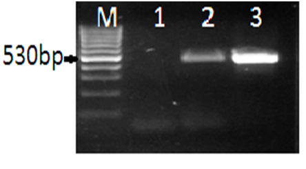 Avian mitochondrial DNA amplification was used prior to PBFDV PCR assay to ensure that DNA concentration and quality were not factors in PBFDV PCR results. Successful amplification of a 530 bp PCR product was achieved from tested avian DNA extracts at the lower and higher DNA concentration values (Figure 3). There were no indications of PCR inhibition in DNA extracts from either blood or feathers. Ten microliters of avian blood were extracted using the DNeasy Blood & Tissue Kit (QIAGEN Sciences, Maryland, and USA). PCR was conducted using the 12S rRNA gene primers.8 Lane M, standard size marker, L1 negative control, L 2&3 test samples.