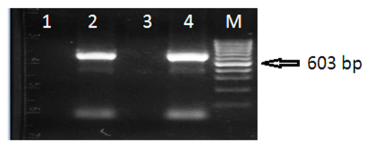DNA from 10 µl of avian blood collected from a suspected bird was extracted using the DNeasy Blood & Tissue Kit (QIAGEN Sciences, Maryland, and USA). PCR was conducted using the PBFDV Rep gene PCR primers as described above. A 603 bp PCR product was amplified from the avian sample. This was the first report of PBFDV in Saudi Arabia (Figure 4, lane 2). The PCR product obtained from that first PBFDV positive sample was used as a positive control after sequence confirmation (as described below). PBFDV PCR-products were used as templates after 1:1000 dilutions. PCR reactions produced a clear positive PCR band of the correct size (603 bp). Ten microliters of avian blood collected from a suspect bird (showing clinical presentation of PBFDV) were extracted using the DNeasy Blood & Tissue Kit (QIAGEN Sciences, Maryland, USA). PCR was conducted using the replicase-associated PBFDV gene PCR primers. Lane 1 Negative control, Lane 2 DNA extract from PBFDV positive sample, lane 3 DNA extract from PBFDV sero-negative sample, Lane 4 PBFDV PCR positive product. Lane M standard size marker.