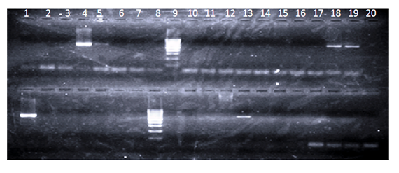 A total of 6 psittacine bird samples were positive using PBFDV PCR (Figure 5 and Table 1). Two positive samples were collected during 2008, 3 during 2009, and only 1 during 2010. All positive samples were collected from clinically suspected birds. Four of the positive samples were collected from Grey parrots (Psittacus erithacus) and 2 from ring neck birds (Psittacula eupatria). It was interesting to notice that the two birds from which both blood and feathers were collected, only feathers were positive to PBFDV. Only two blood samples were positive to PBFDV. All positive samples were collected from the Eastern province. PBFDV PCR screening samples Blood and feather samples were tested using the replicase-associated PBFDV gene PCR primers. Lane 1-20 (upper) screened blood samples, Lane 1-20 (lower) screened feather samples. Lane 4 (upper) and lane 1 (lower) PBFDV control positive. Lane 1(upper) and lane 5 (lower) control negative, Lane 9 (upper) and Lane 8 (lower) standard size markers. Lanes 1-3, 5-8, 10-20 (upper), Lane 2-7, 9-20 (lower) test samples.