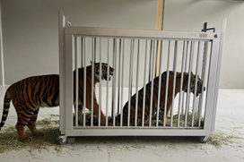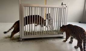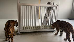 In the initial stages of tiger training, the introduction of a crate serves as a pivotal component in acclimating the animals to confinement and facilitating subsequent handling procedures. Placing the crate within an empty room, adorned with bedding infused with familiar scents such as tiger urine, aims to create an environment conducive to exploration and comfort. During the inaugural session, it is common for tigers to exhibit cautious behavior, opting to circle the crate rather than enter it directly, a natural response rooted in their innate inclination to assess new stimuli (Figure 1 & 2). Progressing to the second day, observations of a tiger leaping into the crate signify an initial curiosity and willingness to engage with the enclosure, albeit accompanied by a degree of restlessness and excitement. This pattern of behavior persists into subsequent sessions, with tigers displaying increased familiarity yet retaining elements of apprehension and frenetic activity upon entering the crate. However, by the fourth session, discernible advancements are noted as tigers eschew leaping in favor of entering with deliberate steps, indicative of a developing sense of comfort and confidence (Figure 3 & 4).