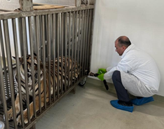 All tigers undergo behavior management training for positive reinforcement, enrichment, problem-solving, and assessment purposes. Health assessment training initiated in the veterinary hospital successfully trained two males and three female Bengal tigers for various procedures such as blood collection, comprehensive physical examinations, and detailed eye examination including infrared and laser therapy. Training sessions commenced with a briefing to review the animal's behavior, temperament, safety concerns, and important notes from previous training. The training took place in a double den with a squeeze cage and adjacent sides, where the veterinarian conducted assessments while the keeper engaged in cooperative feeding training with the animals.