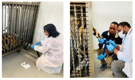 This research highlights the efficacy of systematic training methodologies in promoting tiger welfare and management. By gradually acclimatizing tigers and reinforcing positive associations with confinement, these methods improve overall well-being and ease of handling. The observed calm demeanor and voluntary crate entry signify successful establishment of a positive relationship with the enclosure, reflecting acceptance and acknowledgment of it as a secure environment. Such achievements highlight the effectiveness of systematic training in fostering adaptive behaviors and cooperative interactions between animal keepers and the animals within a scientific framework. Additionally, in veterinary medicine and animal research, collecting blood samples from healthy animals is crucial for diagnosis and investigation. Following strict guidelines ensures animal welfare, while obtaining blood establishes a baseline for comparison during illness, particularly in older animals. Training in voluntary blood draws reduces anesthesia risks, with samples analyzed for hormone levels, pregnancy detection, and guiding treatment decisions by veterinarians.