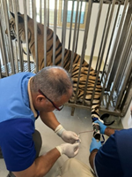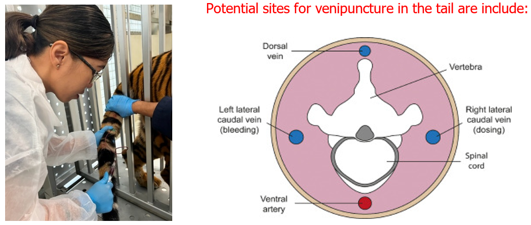 In the final session, the veterinarian successfully withdrew blood from the tiger without any signs of stress. The blood collection was performed through either the median caudal artery or the lateral caudal veins located in the tail of the tiger.