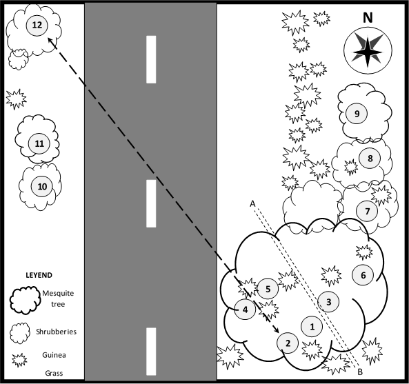 Figure 1 Schematic nesting area of the Common Parauque Nyctidromus albicollis showing the nestlings´ movements from the hatching day to the first flight day. Numbers inside circles: brooding sites. A–B section: trail. Arrow dotted line: longest distance between two brooding sites. Distances between brooding sites (meters): 1–2: 1.1; 2–3: 2.3; 3–4: 3.7; 4–5: 1.5; 5–6: 5.5; 6–7: 9.0; 7–8: 8.0; 8–9: 7.5; 9–10: 21.0; 10–11: 5.3; 11–12: 15.0. Longest distance between brooding sites (2 and 12): 90. Distances in picture are relatives (no metric scale).