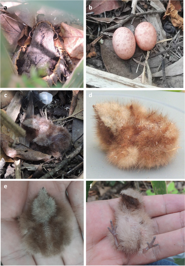 Day 1: Two nestlings and a half eggshell at 10:00 h (Figure 2c). Nestlings were completely covered with long and soft neossoptiles (=downy hatching plumage), cottony aspect (Figure 2d). Neossoptiles: tawny (crown, forehead, supercilium, wings, ventral region, tail), cinnamon (dorsal region), and dark smoky (chin, throat, chest, lore, malar and auricular areas); crown highly contrasted with throat and chest; tawny line along dorsal area; dorsal plumage camouflaged with fallen leaves and understory shadows. Eyes partly open, deep black; bill gray with black tip; nostrils conspicuous; feet blackish above, grayish bellow; nails cream; digit 3 remarkably long. Precocial: few steps or hops when handled. They also uttered a low nasal sound, and responded by raising their heads to the calls of the parent.