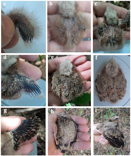Figure 3 Common Pauraque Nyctidromus albicollis plumage development: Day 4, wing papillae appeared (a). Day 5, dorsal pterylae wrinkled and bumpy (b). Day 7, wing coverts, tail, interscapular and pelvic tracts papillae appeared (c), and wing papillae opened (d). Day 9, crown design and uropygial gland appeared (e). Day 10, dorsal region with a vermiculated pattern (f). Day 11, remiges barbs expanding (g). Day 13, ventral (h) and dorsal (i) regions, almost completely feathered, few neossoptiles remain on forehead. Also, primary remiges still extending; white feathers, typical of adult´s wings, still absent (i). Photos: C. Verea.