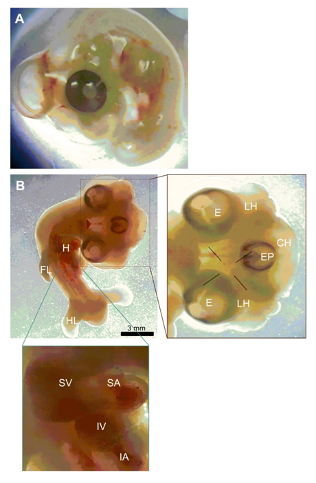 Figure 1 Tricephalia abnormality in 5.5 days old chicken embryo. (A) Normal chicken embryo. (B) Tricephalia chicken embryo. LH, lateral head; E, eye; EP, eye placode; CH, central head; FL, fore-limb; HL, hind-limb; H, heart; SV, superior ventricle; SA, superior atrium; IV, inferior ventricle; IA, inferior atrium.