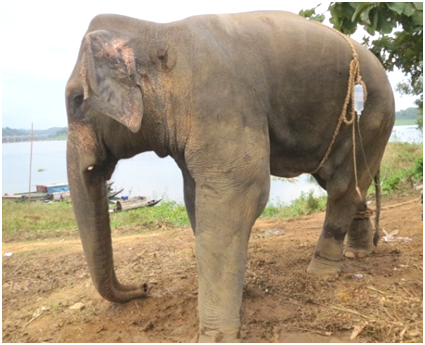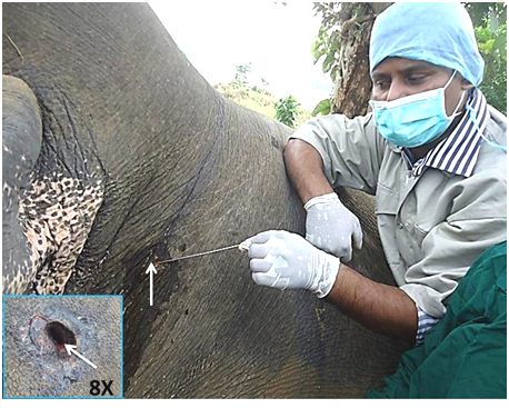 Asian elephant (Elephas maximus) are the largest herbivorous mammals of the world, which is now enlisted as critically endangered species in Bangladesh. Asian elephants were most abundant in the south-eastern part of Bangladesh namely Chittagong Hill Tracts (CHT), but now a days the number of these elephant has declined due to human settlement in the hilly areas that causes the habitat destruction as well as reduction of food availability for them. Gunshot is very frequent/common phenomena in hilly forest areas of the country where conflicts take place between local peoples and elephants. Usually elephants are encountered to gunshot and killed when they attack on human or come to the locality in search of food and destroy crops as well as houses. Apart from, illegal poaching of the species for their ivory, skin or meat is another reason of killing elephant.1–3 With the increase of modern firearms and their widespread access, illegal hunting and gunshot wounds are in rise to the field which bringing about tremendous risk to the animal’s health and life. Generally, firearms like handguns, hunting rifles or shotguns are used legally or illegally to hunt or kill animals silently with no time. Domestic as well as wild birds and mammals are the victim of the accidental or deliberate shooting where death is the most usual outcome.4–6 Gunshot wound has been reported before in different species of wild and domesticated animals or pet.7–10 Therefore the case report is presenting the management and treatment of gunshot wound induced emphysema and inanition as well as post mortem confirmation of the findings.