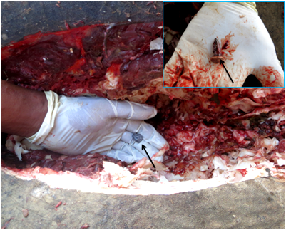 A 10-years-old exhausted wild male Asian elephant (Elephas maximus) was rescued by Bangladesh Forest Department at Rangamati Lake, Chittagong. The elephant was unable to take any food and water orally from the beginning of rescued. To facilitate restraining and physical examination, anesthesia was performed with Xylazine and Ketamine (each 350mg) intramuscularly without premedication. After 15 minutes the elephant was anaesthetized fully and the condition persisted for 100 minutes without any complications. The weight of the elephant was approximately 3000kg .On first day of examination body temperature of the elephant was found normal (98°F); generalized emphysema (Figure 1) with three penetrating wounds was detected. The left eye was blind without any injury. Three penetrating gunshot wounds were diagnosed through physical examination with two on the forehead and one behind the left ear. Each wound was penetrating in nature and more than 12 inch in depth detected by a probe (Figure 2). The elephant had the tendency to eat but grasped foods were dropped from the mouth. No parasites were found on fecal examination however, chronic anemia was detected from blood analysis in laboratory. Generalized emphysema was minimized after three days treatment with corticosteroid (0.04mg/kg) and long acting Oxytetracycline (15mg/kg, IM). Vitamin B1 and B12 were used as an adjunct treatment (Figure 3). Fluid therapy (5% dextrose) was continued (15,000-20,000ml/day) to check the dehydration. Oxytetracycline was replaced with Ceftriaxone (7mg/kg) for the following seven days. The elephant gradually became weaker due to starvation and finally died after 12 days of treatment. After postmortem examination two bullets were found within the frontal sinus and one beside the pharynx (Figure 4). The dead body was buried at the bank of Kaptai Lake after collection of its ivory.