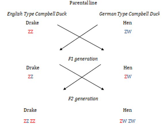 The German type of Campbell originated from crossbreeding the English type with the Orpington duck (Figure 8). We have not determined the exact genetic code for the German type Campbell, but we know that the Orpington duck has a recessive gene for the buff color (bu-) and a dominant gene for the blue color (Bl). These genes, in combination with other genes, suppress certain markings and lighten parts of the plumage. Therefore, we assume that German type Campbell ducks have suppressed black wild markings on the brown base color typical of the English Campbell or they may have the wild black markings lightened to brown, which is not as noticeable on the brown base color. We proposed a crossing scheme from the parental generation to the second filial generation. The red color represents the gene for the English Khaki Campbell, and the blue represents the gene for the German type. In the first generation, we obtained ducks with a distinct wild marking, resembling the English Khaki type. The drakes, which carried one English and one German gene, resembled the German type more. They were darker than the parents and had a better transition of the green color from the head down to the chest. This led us to the theory that the German Khaki Campbell has a more dominant gene compared to the English one, as this trait was more pronounced in the drakes. The individuals from the first filial generation were used as parents for the second generation after selection. We selected drakes with the largest body frame that most closely resembled the German type in color and markings, and hens with the least pronounced wild markings.