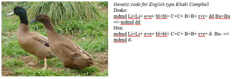 For Khaki Campbell, we will only need some of these genes. The Khaki Campbell should contain the dusky mallard recessive gene and the chocolate dilution recessive gene. These genes, when combined, create the characteristic Khaki Campbell coloration (Figure 7).