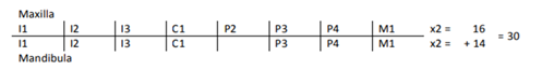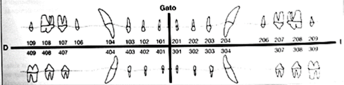 Felids are diphiodonts, which means that throughout their life they have two changes of teeth.4 The first teeth are known as deciduous teeth, which appear in puppies 2-6 weeks old. These are replaced by permanent teeth at approximately 3 months of age. According to Bollez,4 all Felidae species have a total of 26 deciduous teeth and 30 permanent teeth. To identify the teeth, the initials of the tooth are used, being I (incisors), C (canines), P (premolars) and M (molars). In Figure 1 we can see the dental formula of an adult cat.