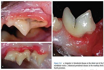 Figure 5 Periodontal disease in cats (a) Gingivitis; (b) Established periodontitis in the mandibular first molar; (c) Advanced periodontitis in the third and fourth premolars of the maxilla.8