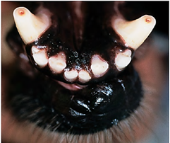Figure 6 Wear of incisor teeth without pulp exposure and wear of canines with exposure of dental pulp.11