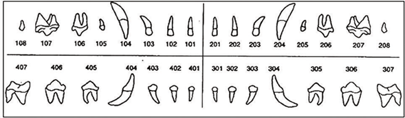 There are several dental nomenclatures, but the system internationally recognized by the International Dental Federation (FDI) and the World Health Organization is the modified Triadan nomenclature.9 In this nomenclature, each tooth is represented with a three-digit number, as seen in Figure 2. The first digit refers to the arch where the tooth is located, the second and third digits refer to the type of tooth, then remaining as follows: