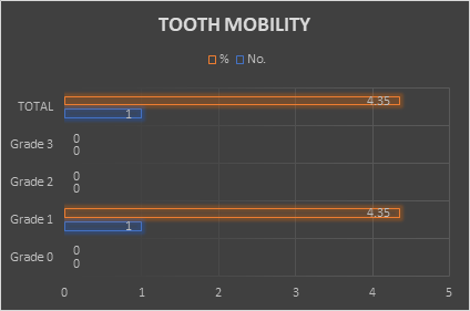 Bellows8 mentions that, physiologically, the teeth have a certain mobility, which should be less than 0.2 mm in the incisor teeth and the rest of the teeth should not have any mobility. Also, he mentions that pathological mobility is in response to the forces of occlusion, trauma or reduction of the periodontium. Mobility is not diagnosed as a periodontal disease as such, but reflects a certain pathological adaptation of the periodontium. Mobility can be categorized into different degrees: