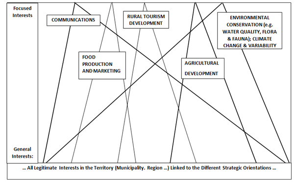 On Figure 1, the horizontal axis represents all of the different actors (including citizens) who might have an interest in one or more Strategic Orientations. At the top of each Strategic Orientation we find the actors who are quite obviously directly interested in the actions taken in the particular Strategic Orientation, e.g. for Agricultural Development, we would expect to find farmers and their families primarily involved and then the companies and counselors who provide inputs and information to the farmers. Further down, we would find other actors interested more in such issues as water quality, landscape conservation and the conservation of flora and fauna. Strategic Development Planning can be implemented at different levels, although it is easier to involve a wider range of citizens and collective actors when the planning process is being undertaken for local (e.g. communities) and regional e.g. (counties) jurisdictions. Different elements of strategic development planning can be seen in communities and regions in Northern British Columbia, Canada, and also in Peel Region in Ontario, Canada Peel Region 7 and as well at a country level, e.g. for tourism development in Italy Angeloni8 (Figure 1).
