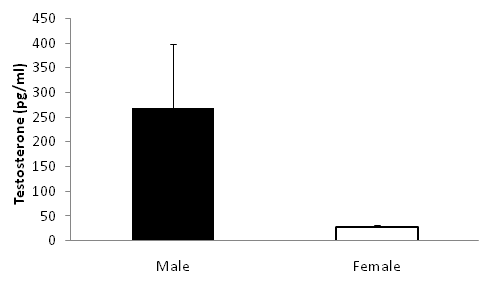 We used methods described by O’Fegan20 to validate the Salivary Testosterone Enzyme Immunoassay (EIA) kit (Salimetrics). The EIA kit is capable of measuring testosterone in small-volume avian plasma,21 and is sensitive enough to detect biological changes in the gonadal activities of small birds.22 The slopes of serial dilutions were parallel to the standard curve for male plasma (t=-0.25, p=0.81) and female plasma (t=-0.11, p=0.91) indicating that bluebird plasma does not interfere with the ability of the anti-testosterone antibody of the Salimetrics kit to bind to testosterone in avian blood samples.23 Intra-assay variation for high controls was 1.63%±2.00 and12.69% ±6.09 for low controls. Inter-assay variation was 7.37% and 7.60% for high and low controls respectively. Male samples were diluted to 1:4 plasma/ assay diluents and female plasma was not diluted due to the expected low concentrations of testosterone. Plasma from individuals with very low testosterone concentrations was spiked using 24pg/ml standard and unknown concentrations were then back calculated.