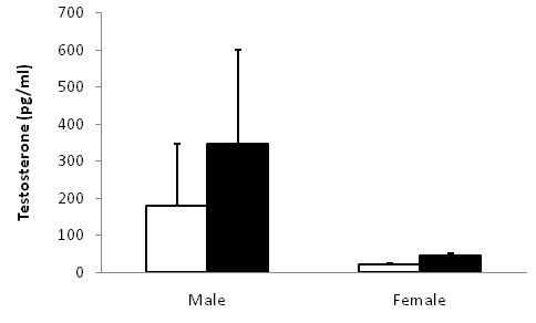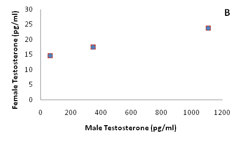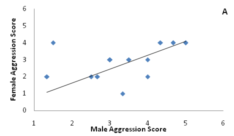 Males exhibited marginally higher testosterone concentrations than females (Figure 3, t=1.88, p=0.05). On average, individuals that exhibited high aggression did not differ in circulating testosterone than individuals that exhibited low aggression among males (Figure 4, one-way ANOVA, F1=0.16, P=0.71) or females (F1=2.34, P=0.16). Females paired to males had weakly correlated aggression scores (Figure 5A, F1=4.03, P=0.07) and testosterone concentrations (Figure 5B).