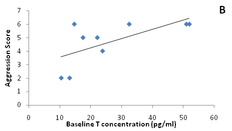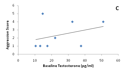 Second we asked if baseline testosterone concentrations and aggressive behavior covary within individuals. We predict individuals with high baseline testosterone concentrations will exhibit more aggression than males with lower testosterone concentrations. We used baseline testosterone because it likely indicates the long-term social environment of the individual. Males exposed to more territorial intrusions exhibit higher baseline T than males in less competitive environments.16