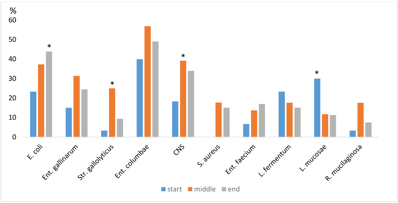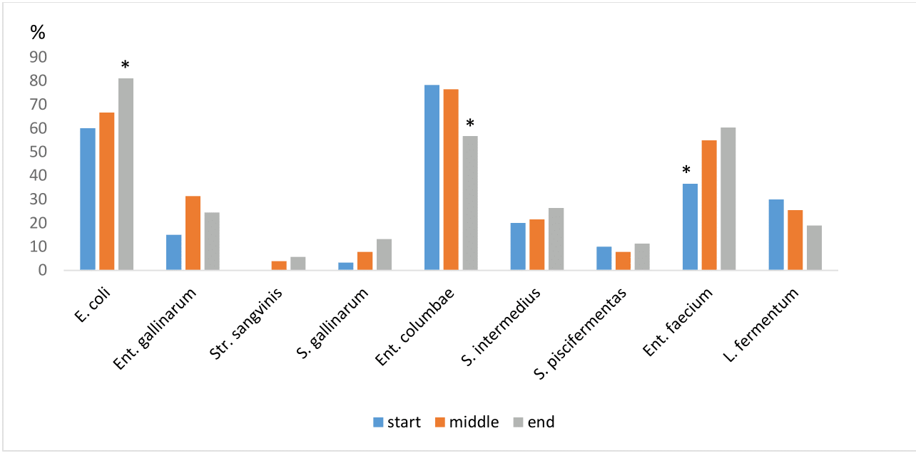 In the monitored pigeons, the high TCB was determined from cloaca swabs, which indicates natural colonization of the gastrointestinal tract. The TCB levels in both the cloaca and the crop did not show any significant variation in their abundance throughout the entire racing season. On the other hand, with increasing stress and the occurrence of diseases, the CB in the cloaca and crop was increased in the middle and at the end of the racing season (Graph 1). Of the identified bacteria a relatively high representation of Ent. columbae was recorded at the beginning of the race season, namely 78,3% in the cloaca. Isolates of E. coli and Ent. faecium had also a high representation from cloaca swabs (Graph 2).