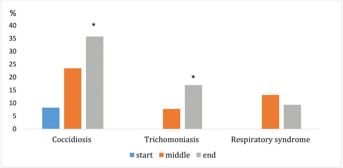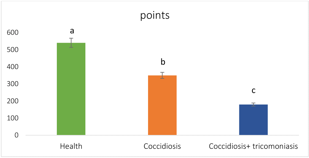 Among the most common clinical symptoms, we observe: skin rashes, reluctance to move, redness around the feather follicles, sneezing and nasal discharge, loss of appetite, depression, fluffy feathers, watery diarrhea and weight loss.17 An increased incidence of staphylococci from crop swabs was recorded in pigeons with respiratory syndrome, especially at the end of the race season. Scullion18 confirmed that the occurrence of coccidiosis in feces may not always be clinically manifested and that adults can overcome this disease. The evaluation of the number of protozoa from the feces samples did not correlate with clinical manifestations, which means that in adults this disease manifests itself as a secondary factor due to the combination of several factors with immunosuppression of the organism. By evaluating the results of our work, we are inclined to this statement, because despite the samples positive for Eimeria spp. with an infection intensity estimate of +, these individuals showed no signs of disease. However, their performance was reduced, which was confirmed by obtaining fewer points compared to healthy individuals (Garph 4). Coprological examination of feces (Eimeria spp.) and from sampling from oropharynx for the diagnosis of Trichomonas spp. we did not confirm their presence in any of the investigated pigeons in the monitored breeding at the beginning of the race season. Their highest incidence was recorded at the end of the season, but all positive individuals were without clinical symptoms (Graph 5). These findings point to a well-set and implemented prophylactic program in monitored pigeon breeding that is effective and helps to cope with frequent infectious agents.
