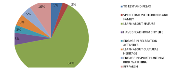 Figure 3 show the percentage distribution of visitors based on their motive and it was observed that the primary aim of 64% of the visitors is to learn about nature, while 10% of them were there in order to carry out research work (Table 2) (Figure 3). Products offered to visitors include Park viewing, Water recreation, Sport fishing, Tour to cultural sites/festival, Hunt with personal camera, Accommodation, Natural history museum and lake cruise. Facilities within the Park include Restaurant, Health care center (sick bay) and tour guide. There are no facilities for people with physical challenge both does the Park has Tour Guides but has efficient Rangers and other Staff who are highly proficient to fill in the gap. The Park also has Nurses who can take care of any emergency within the Park. Survey of accommodation facilities within the Park revealed that there are Executive Suite (2), Executive Suite (7), V I P Lodge (4) and Double Chalet (6) which is adequate for the present influx of visitors. There are no adequate vehicles to convey visitors within the Park as there are only Toyota Hilux (6), Land Cruiser (2), Toyota Coastal Bus (1), Peugeot 504 station wagon (2), Land Rover (5) and Tractor (2) which is meant to cater for both Staff and Visitors (Table 3).
