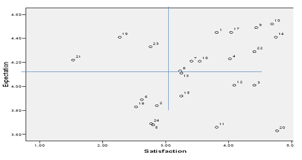 To make inferential statements, the mean score was compared with the critical mean 3.0, if the calculated mean is equal to or greater than the standard critical value for expectation, it means that the tourists expectation was met, if it is lower, it shows that the tourists expectation was not met. Also for satisfaction if the calculated mean is equal to or greater than the standard critical value for expectation, it means that the tourists were satisfied, on the contrary, if it is lower than the critical value, it means that the visitors were not satisfied. An expectation-satisfaction matrix was developed, based upon the grand mean; tourists’ expectation was divided into two groups, namely low-and high-expectations. Similarly, satisfaction level of tourists was grouped as low- and high-Satisfaction levels. In this context, there were four different quadrants in the matrix. The quadrant “A” group high-expectation and high-satisfaction, the quadrant “B” is low expectation and low-satisfaction, quadrant “D” is high-expectation and low-satisfaction, and the quadrant “C” indicates low-expectation and high-satisfaction. Destination attributes were distributed in the matrix according to their grand means.