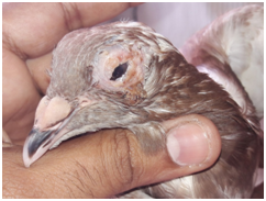 Out of 72 pigeons in a flock, four were presented to the Veterinary Clinical Complex, College of Veterinary Science, Proddatur with history of skin lesions. Pigeons showed the blepharitis, conjunctivitis, ocular discharges and cutaneous lesions over the beak, around the external nares, on the legs including digits and peri-cloacal region (Figure 1) (Figure 2) (Figure 3) (Figure 4A). Lesions were small, focal, nodular greyish to white scab and condition was diagnosed as cutaneous form of pox.3,4