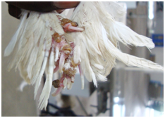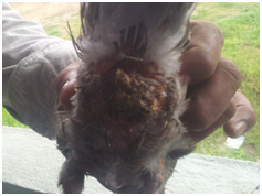 Pigeons with cutaneous form of pox were randomly divided into two groups and group I were treated with azithromycin (n=26) and Group II placebo treatment (n=6). Azithromycin (20mg/kg body weight) was administered orally twice in a day, oral multi-vitamin supplementation syrup, liver tonic for two weeks and skin lesions was acleanpplied with povidone iodine ointment. Pigeons under the control group (II) were treated with nutritional supplementation alone. Improvement of the clinical condition was started by disappearance of the skin lesions; scab and complete remission of the cutaneous lesions were noticed after 10 to 12 days of therapy (Figure 4B). Out of 24 birds, 3 were died in the group I and 5 were died out of 6 birds in the group II. Details of the clinical improvement were mentioned in the Table 1 and Figure 5.